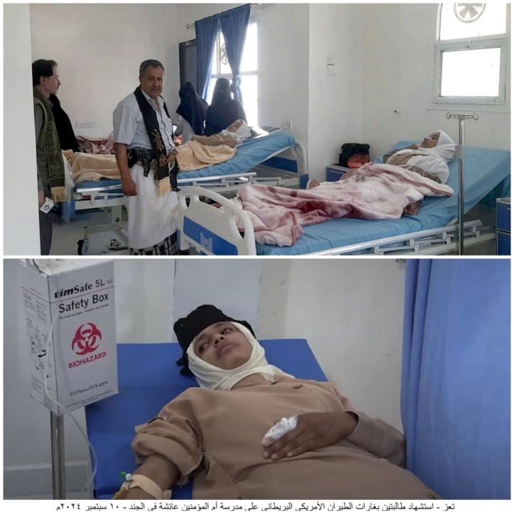 “Two female students were martyred, and nine others were injured as a result of two airstrikes by American-British aggression today, Tuesday, near Umm Al-Mu’mineen Aisha Girls School in Al-Jund, Taiz Governorate.