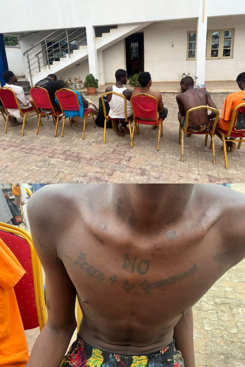 He also listed the names of the arrested suspects as follows: Ugochukwu Onuorah, aged 30; Ikemefuna Ossai, aged 20; Ikenna Orugu, aged 27; Chibuike Obiefuna, aged 19; Chinonso Olisa, aged 19; Chinedu Okoli, aged 21; David Ojini, aged 25; and the most notorious of them all, Peter Sunday, aged 20, with a large tattoo inscription of “No Peace 4 d Government” on his chest.