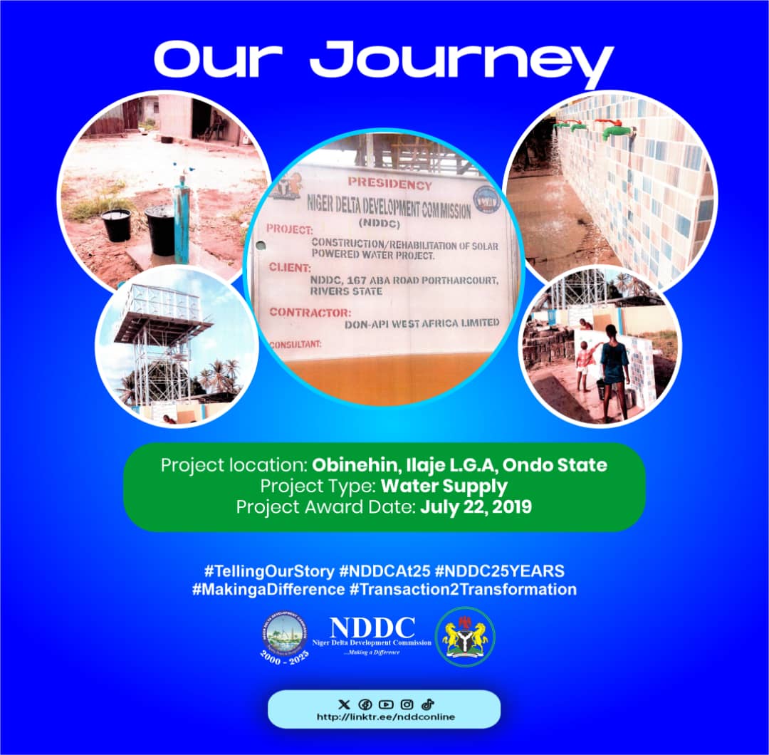 For instance in far away Obinehin, in Ilaje Local Government Area, the NDDC provided access to clean drinking water by constructing a solar powered water project in Ilaje Local Government Area in Ondo State.
