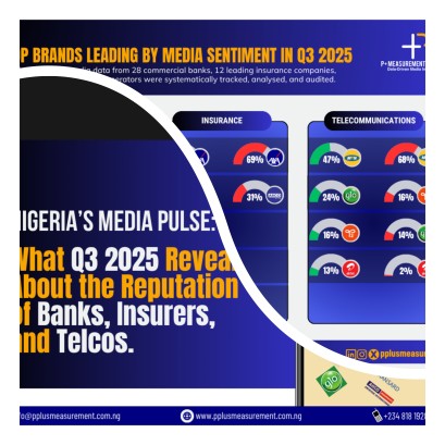 A new report by P+ Measurement Services, Nigeria’s leading independent media intelligence consultancy, provides a data-backed analysis of how reputational factors shaped public narratives across the banking, insurance, and telecommunications sectors in the third quarter of 2025.