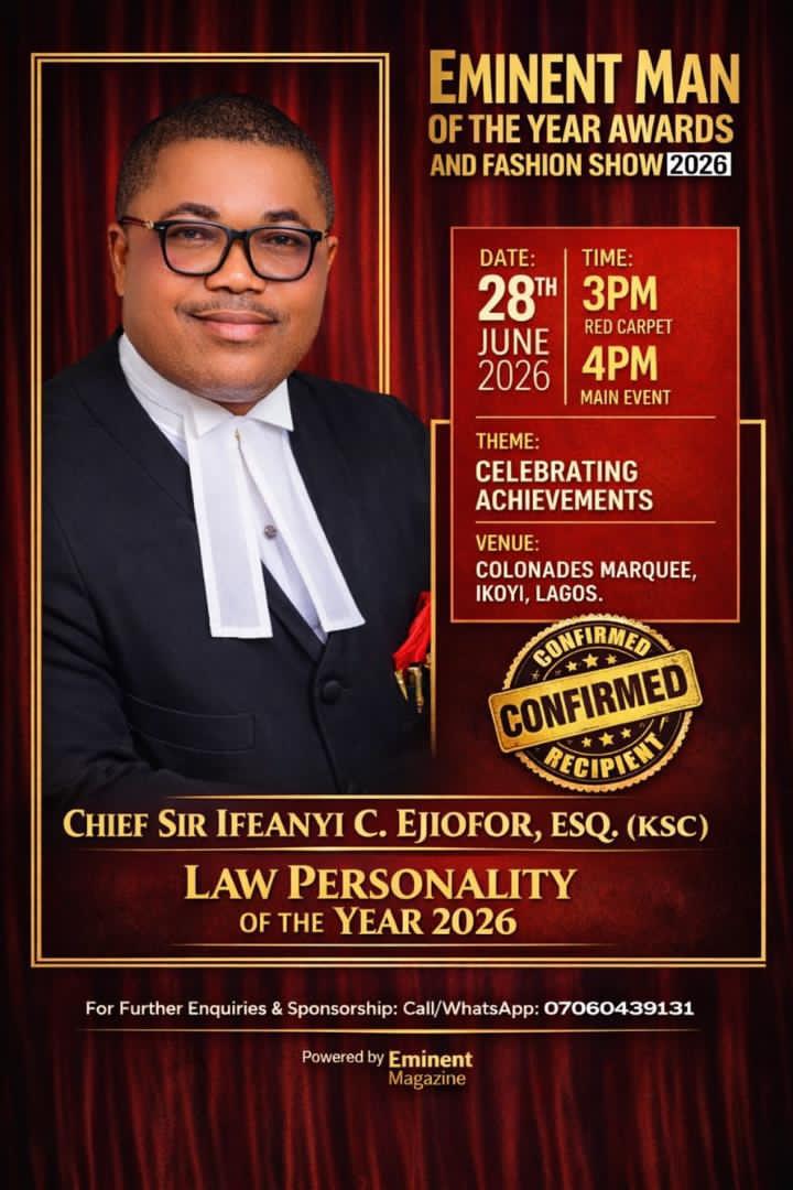 In a statement issued by Ejiofor on Wednesday titled “Midweek Musing: Nomination , Law Personality of the Year 2026,” he described the honour as a recognition of his distinguished and unwavering commitment to the rule of law and the pursuit of justice in the country.