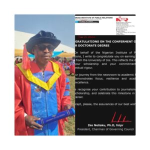 LAGOS, Nigeria – The Nigerian Institute of Public Relations (NIPR) has congratulated Arise Correspondent, Dr Friday Olokor who was conferred with a Doctoral Degree by the University of Jos (UNIJOS).
