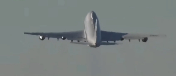 Terrifying footage captured by Rapid Report shows the massive Boeing E-4B Nightwatch—a flying command centre designed to survive a nuclear blast—roaring into the skies.
